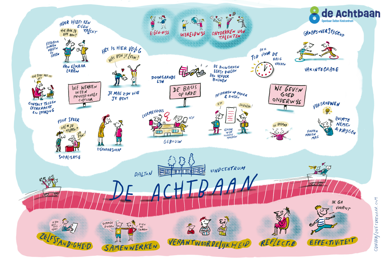 - Binnen ons kindcentrum benaderen wij ons (onderwijs)aanbod vanuit de daltonkernwaarden: samenwerken, zelfstandigheid, verantwoordelijkheid, reflectie en effectiviteit.